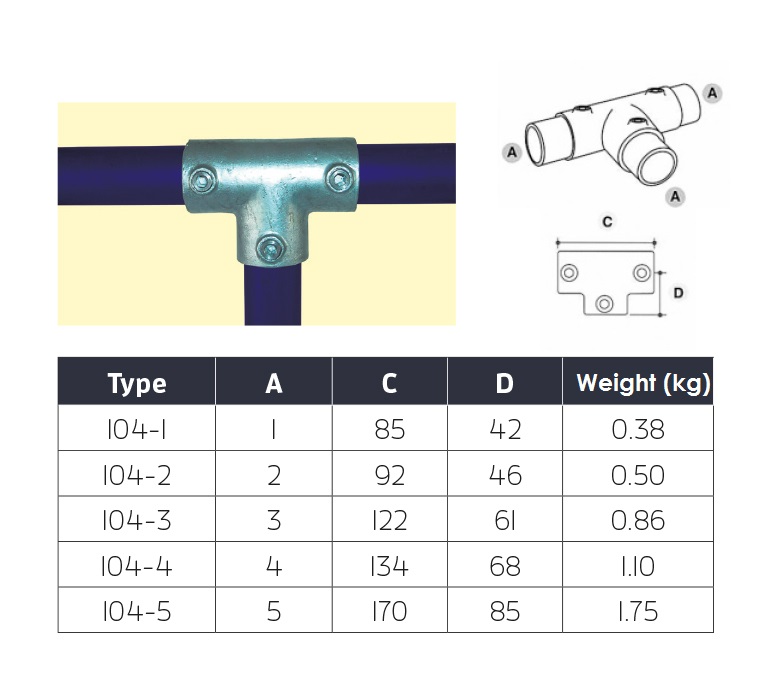 The 104 Long Tee is a 90° connection fitting, ideal for connecting vertical posts to the top rail of a straight and level guardrail or handrail. It is weather resistant and strong, and this clamp fitting can be used where two lengths of tube need to be joined together within the top of the fitting. As with most of our key clamp fittings, the 104 Long Tee is available in 5 different sizes, correlating with our tubing options. Ezi Klamp always holds stock of this fitting and guarantees fast delivery so that you can keep your project on track easily and efficiently.
