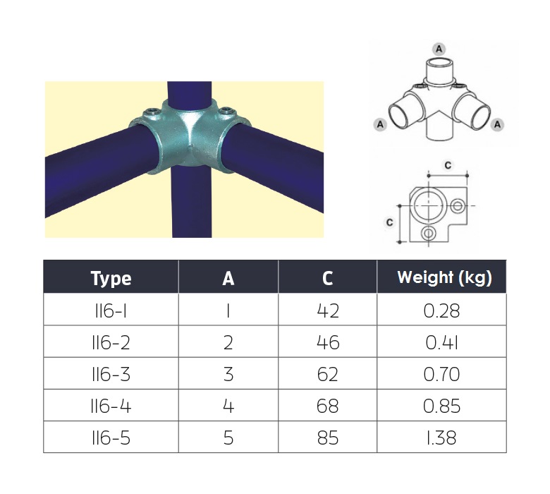 This 90° corner joint is specially designed for use in a handrail or guardrail to continue the midrail along around a 90° corner. In addition to this, it can be used to build quadrangular structures. The upright tubing passes vertically through the 116 Midrail Corner and is often used with the type 128 Top Corner. This key clamp is available in 5 different sizes. Ezi Klamp keeps a good stock of the 116 Midrail Corner at our Bristol base, and will deliver faster than rivals to ensure your project runs smoothly.