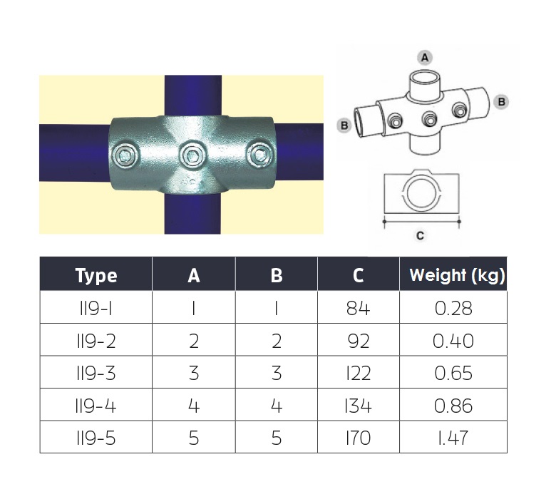 The 119 Midrail Cross key clamp is a 90° joint, most often used to connect a midrail to an intermediate vertical post in either a straight or level handrail or a guardrail, with the upright tube passing up through the fitting. As with most of our key clamp fittings, this product is available in 5 separate sizes, allowing you to use the one that will suit your project best. There is always availability of the 119 Midrail Cross joint at out Bristol warehouse, and we offer fast delivery so that you can progress easily with your project.