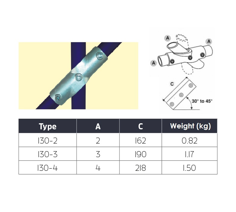 This angle cross is usually used on a handrail on a staircase or other descent, joining the midrail to the intermediate posts. It is adjustable between 30-45° to allow for varying degrees of incline. The 130 Adjustable Cross, as with all of Ezi Klamp’s products, is of high quality. It is available in sizes 2-4. It is kept in good stock at our base in Bristol and can be delivered promptly to ensure there are no delays to your project.