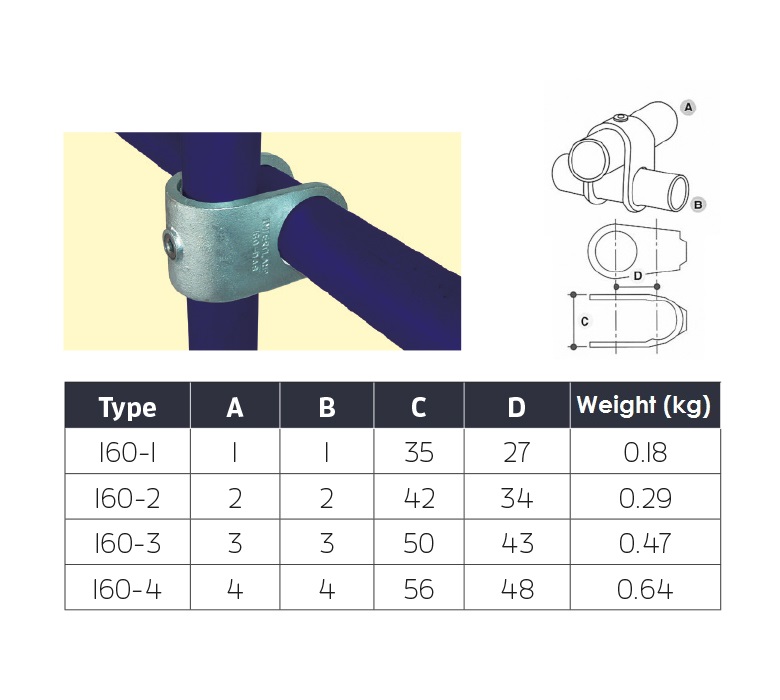 The 160 Clamp-On Crossover fitting is usually used to add to existing structures. It forms a 90° joint between tubes in a handrail, guardrail or other structure and is usually used to retro-fit a horizontal tube to the existing structure. This key clamp is useful when dismantling an existing construction is impossible as it allows you to make alterations rather than having to build new structures. It is available in sizes 1-5. The team at our warehouse in Bristol will be happy to pack and dispatch your order as quickly as they can so that your project can progress with all due haste.