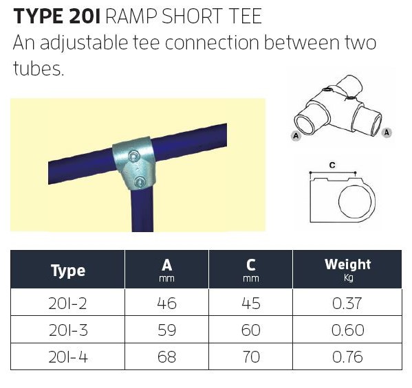 This key clamp is a tee connection often used in handrails along a ramp or other shallow gradients to connect the upright posts to the top rail, or to connect the midrail to the end post. The 201 Ramp Short Tee is available in sizes 2-4 and is adjustable between 0°-11°. It cannot be used where two lengths of tube meet in the middle of the fitting. This tee fitting is always in stock at our warehouse in Bristol and can be dispatched for next-day delivery to ensure your project progresses quickly and smoothly.