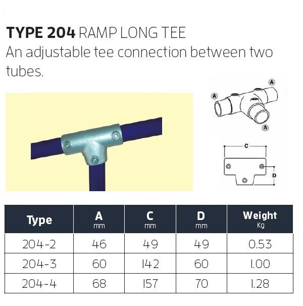 This tee connection fitting is adjustable between 0°-11°, making it perfect for use on a handrail on a ramp or other light decline. This fitting can be used where two lengths of tube need to be connected within the fitting. This key clamp is available in sizes 2-4. As with all our products, the 204 Ramp Long Tee is always kept in good stock at our warehouse in Bristol, enabling us to deliver the goods quickly so that your project runs smoothly.