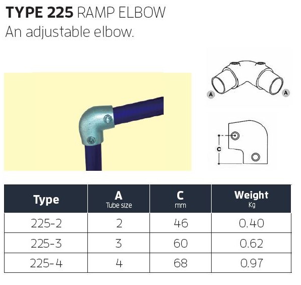 This key clamp is an elbow fitting, most often used in a handrail or guardrail on a slope or ramp of 0-11°. This fitting can be used to join the top rail of a structure to the end vertical post at either the top or the bottom of a run of handrail. This fitting is an excellent option for your project and can be used with our tubing to create a strong, stable handrail or other structure. It is available in sizes 2-4. The 225 Ramp Elbow fitting is kept in stock at our warehouse in Bristol all the time, allowing our team of experts to get your order delivered quickly.